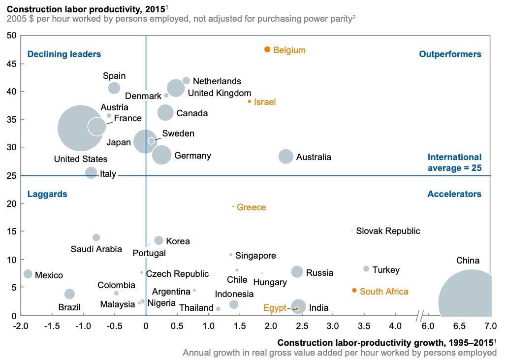 Per this graph, circa 2015 the UK had around 0.5% construction productivity growth since 1995, while per our calculations it would be slightly negative. Sweden and Germany similarly have positive construction productivity growth under this analysis, while per our calculations they were slightly negative. Both calculations show Belgium having positive productivity growth, but McKinsey has a growth rate that’s about twice as high as ours. And where we have a construction productivity growth rate for China of around 1.4-1.9% per year, McKinsey has it as closer to 7%.