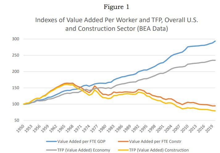 We’ve spent a lot of time examining the problem of construction productivity in the US — the fact that, across a variety of different metrics, construction never seems to get any more efficient (in terms of how much output you get for a given amount of input), or any cheaper. A paper I wrote about by Goolsbee and Syverson, for instance, titled “The Strange and Awful Path of Productivity in the US Construction Sector,” looked at a variety of different productivity metrics and found that they all show either flat or declining productivity. By contrast, other sectors (such as manufacturing), as well as the economy overall, tend to show increasing productivity.