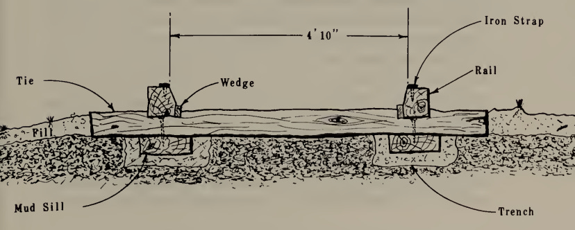 But this thrift wasn’t without consequence. While cheaper to build than solid iron tracks, strap rail lines decayed quickly, and had incredibly high maintenance costs, over twice as much per mile as iron rail (material culture 192). Rather than being built atop crushed rock (which would allow for proper drainage), strap rail lines were typically placed directly onto the ground. Mold, insects, and moisture quickly went to work on the wooden rails, and after a few seasons they became “a hopeless ruin”. And strap rail lines were dangerous: the repeated impact of the locomotive wheels could cause the iron straps to curl up at the ends of the timbers, in some cases derailing trains