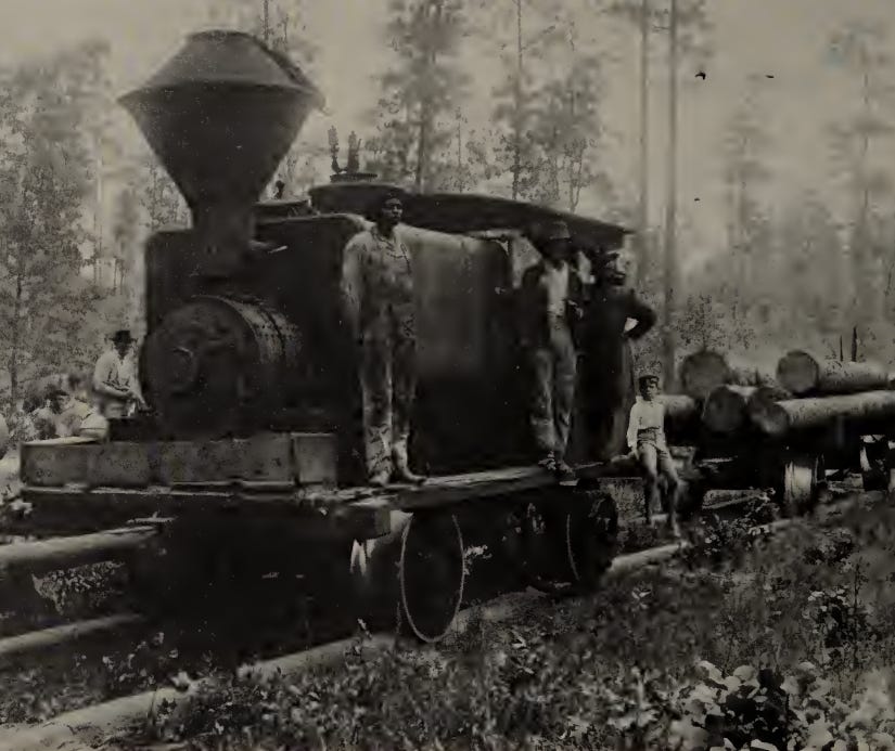 An even cheaper type of wooden railway was occasionally built for logging railroads to transport felled timbers: the pole road. A pole road was nothing more than two rows of logs, laid parallel on the ground, and tapered so that one log could fit into the next. “Locomotives”, little more than modified agricultural steam tractors, would ride on top of these poles on flanged wheels that wrapped around the poles. Like strap rail, pole roads were inexpensive to build but decayed incredibly quickly, and by the end of the 19th century had become increasingly rare