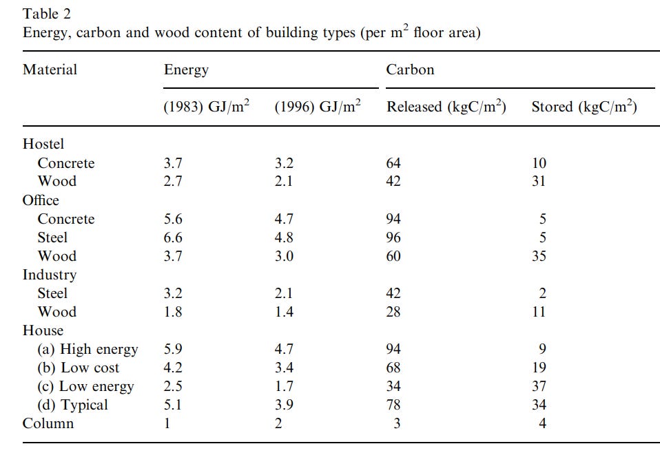 And wood performs even better than these numbers suggest, because of where that energy comes from. 95% of the energy required for manufacturing lumber products comes from the kiln drying process, which brings the moisture content of wood below 20%. But this process can be fueled by burning the wood detritus left over from sawing the logs down into planks. 65% of a sawmills energy comes from burning this waste wood - an energy source that has no transport, logistics, or refining costs (since it’s right where the wood has been sawn) and is carbon neutral (since it’s just releasing the carbon the wood fixed in the first place).