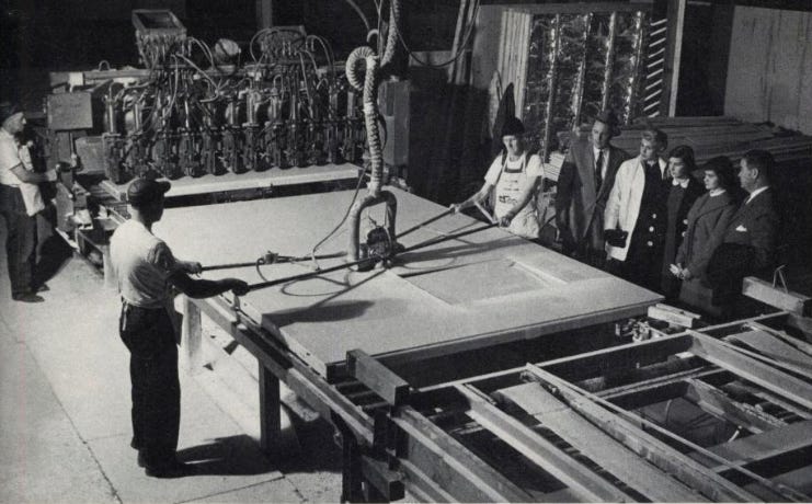The potential efficiency gains and cost savings of factory-based construction have been a driver of numerous prefabricated — factory-built — homebuilding efforts. They were behind the Lustron Corporation, which received $37.5 million (over $500 million in 2026 dollars) in government funding to produce an enameled-steel panel home in an enormous former aircraft engine factory following WWII. They fuelled Operation Breakthrough, a 1970s US government initiative to kickstart the industrialized production of housing. They formed the core thesis of Katerra, a construction startup that in 2018 raised over $2 billion in venture capital on promises of driving down the costs of construction with factory methods (disclosure: I formerly managed an engineering team at Katerra).