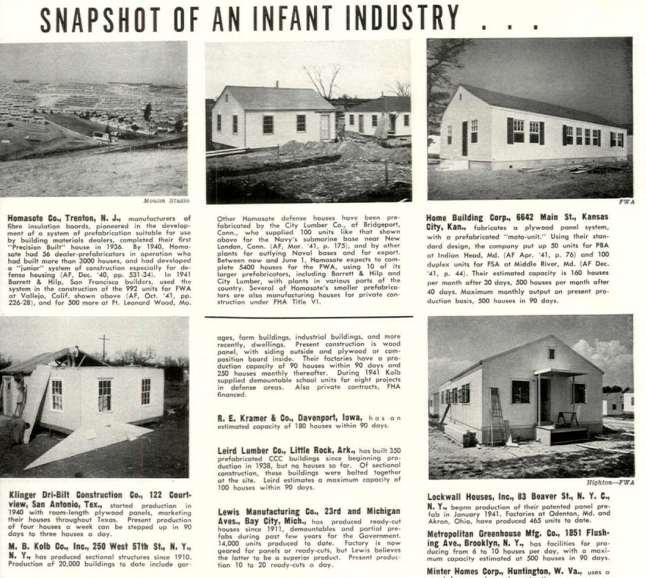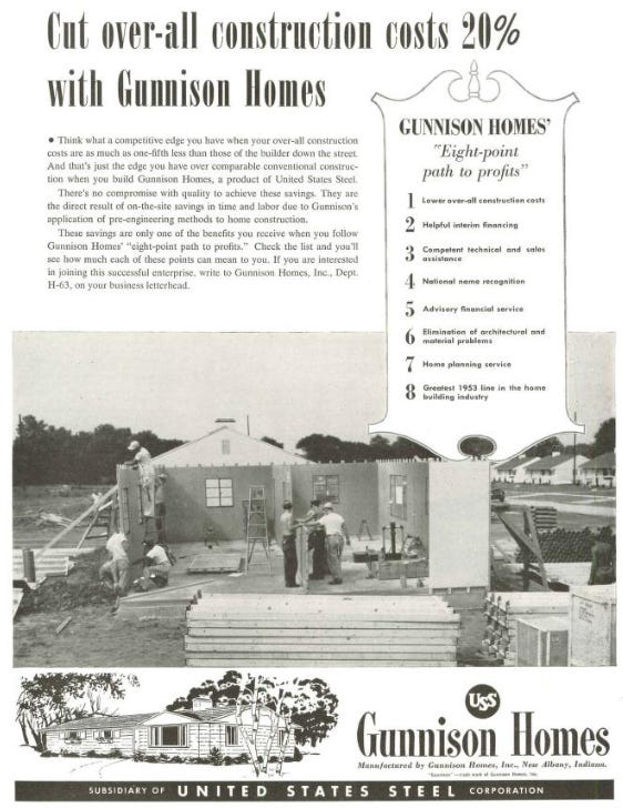 But other prefab companies found more success. In 1934, Foster Gunnison, a salesman of lighting fixtures, founded “Gunnison Magic Homes” (later shortened to Gunnison Homes), which aimed to “bring the full benefits of mass production technology to a backwards industry.” Gunnison hired manufacturing experts from car manufacturing, and developed a system of panelized construction using stressed-skin plywood construction (where the plywood exterior carries the weight of the structure, rather than wood studs) first developed by the US Forest Products Laboratories. Gunnison aimed to make his company “the General Motors of the homebuilding field,” and by 1944 Gunnison Homes’ factories were producing 600 houses a month. And in 1940, brothers George and James Price founded National Homes, producing prefabricated wood panel homes in their factory in Lafayette, Indiana. Within two years, National Homes had produced over 3600 homes. Overall, between 1935 and 1940 prefabricators produced an estimated 10,000 homes in the US.
