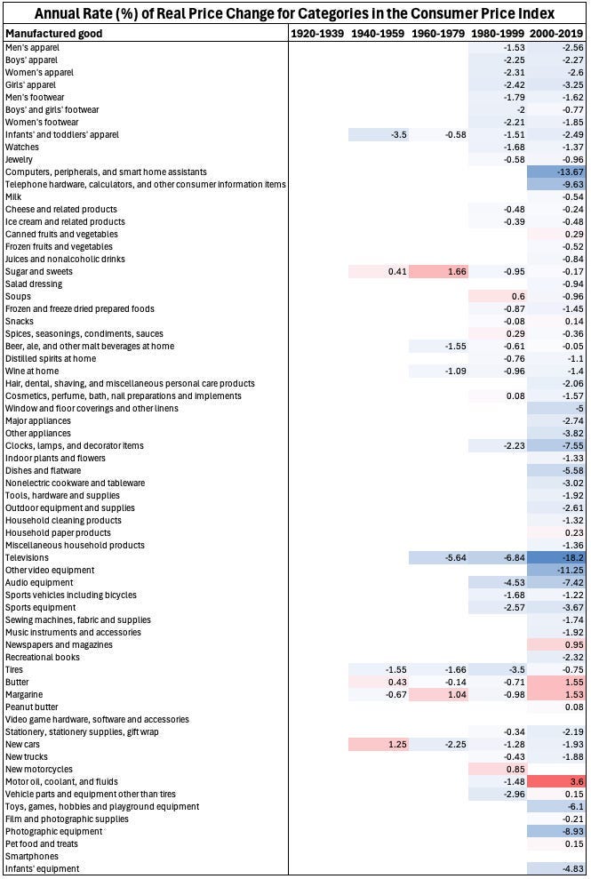 Since automobiles transitioned from craft to industrialized production, the cost of cars has continued to fall in inflation-adjusted terms. And we see this pattern more broadly with manufactured goods: they tend to get cheaper over time. If we look at categories of manufactured goods in the consumer price index over the last several decades, nearly all of them have fallen in price in real terms.