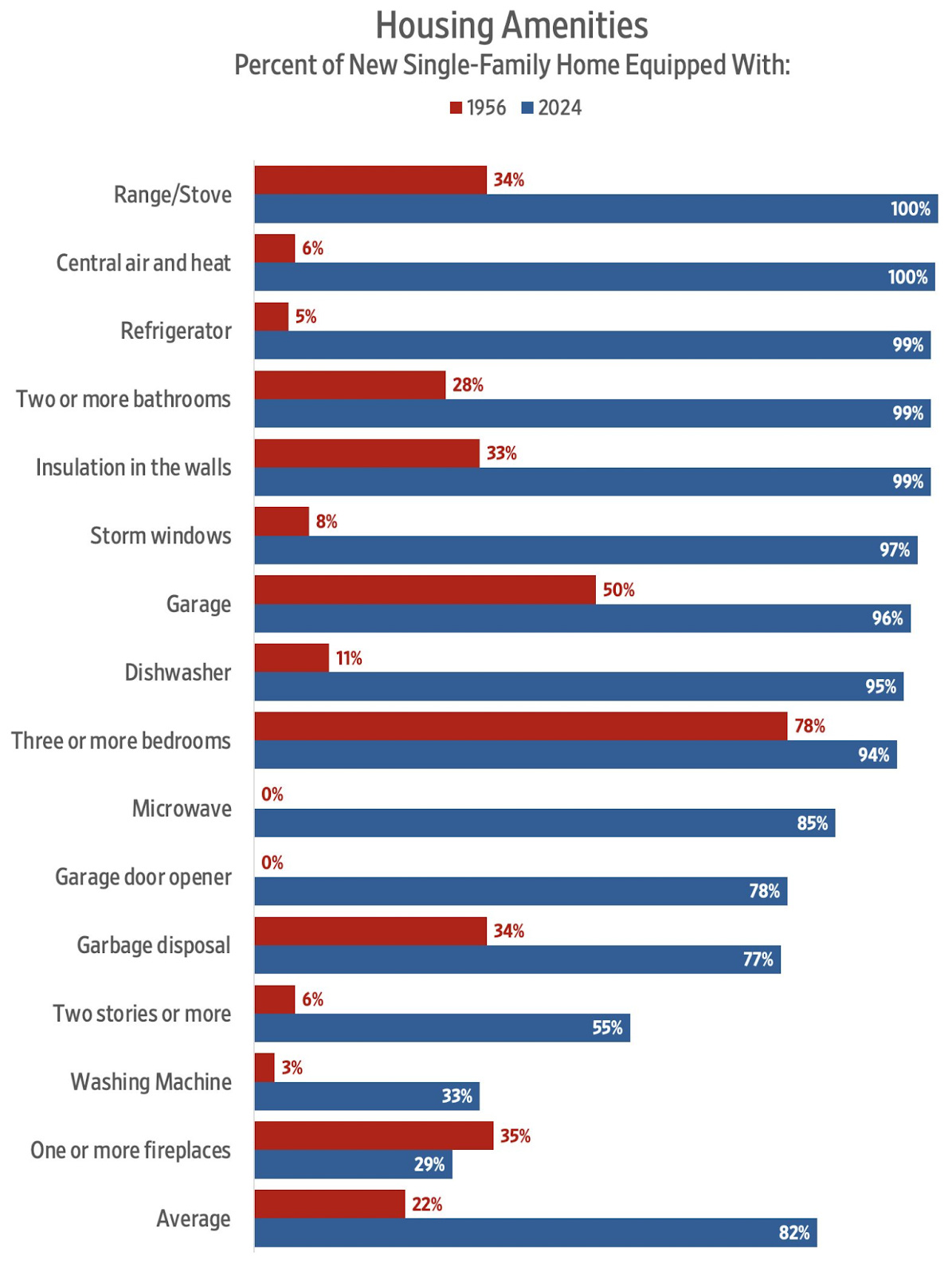 This particular distortion is relatively easily corrected by multiplying the number of homes produced by average home size, to get “square feet of home produced per employee”. As we’ve noted, several studies of construction productivity use this metric. But increasing size isn’t the only way that homes change over time. For one, modern homes are built to stricter building code standards than older homes; they will have greater fire resistance, greater ability to withstand high winds and earthquakes, and greater energy efficiency. For another, modern homes have more amenities and services in them: they’re more likely to have air conditioners, dishwashers, insulation, generally will have more bathrooms, and so on. Thus, a square foot of home built today should be considered as more output than a square foot of home built in 1960.