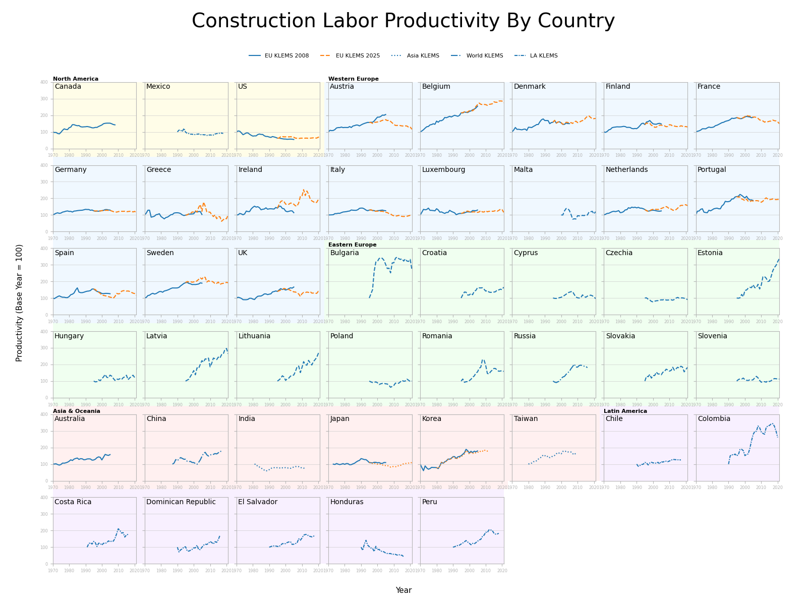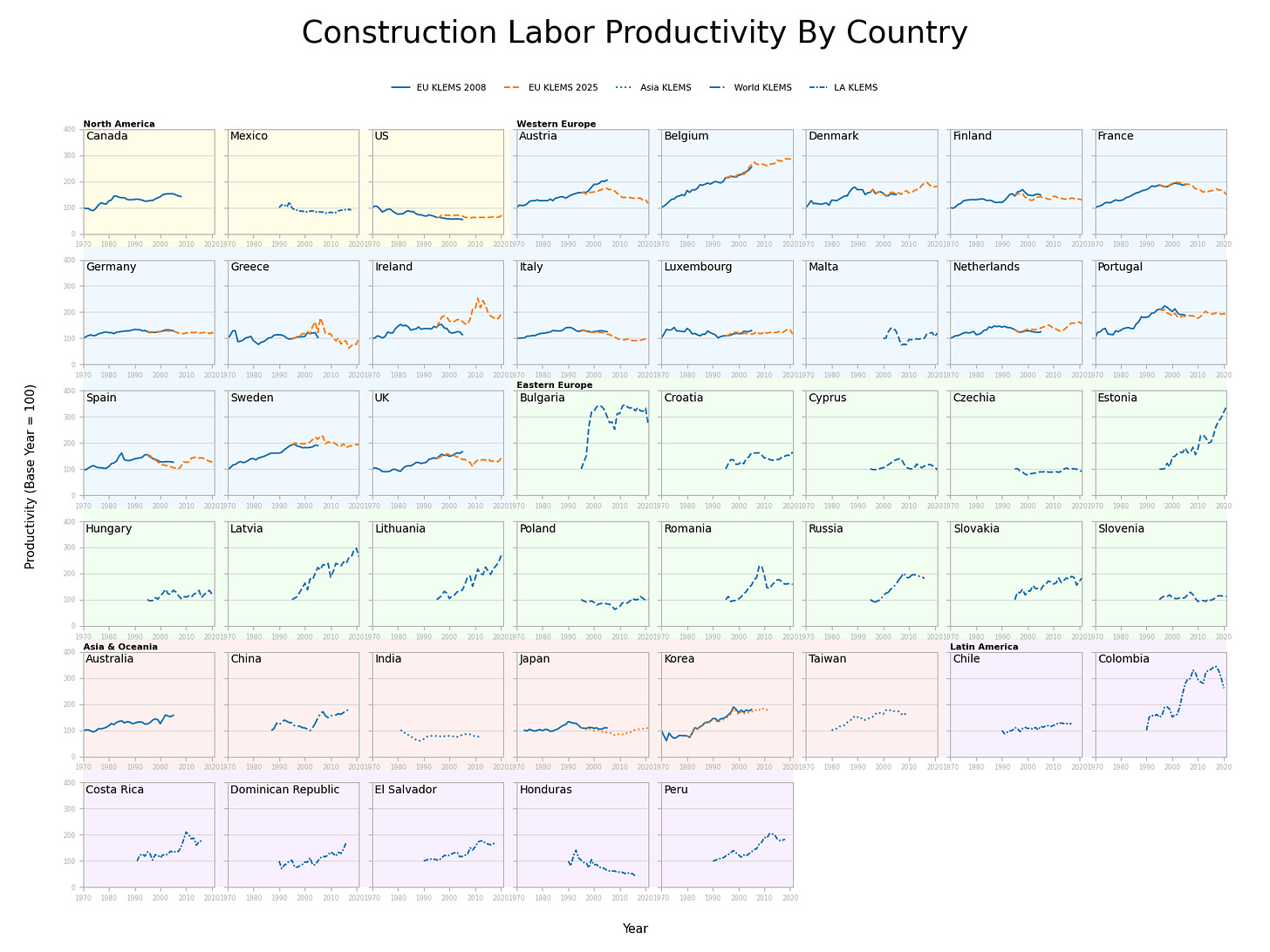 We can look at international trends in construction productivity at the sector level by using KLEMS databases, which aggregate industry-level productivity data for countries around the world.2 EU KLEMS has productivity data for European countries, as well as the US, UK, Japan, and (for older releases) Korea, Canada, and Australia. Asia KLEMS has productivity data for Japan, Korea, Taiwan, and India. LA KLEMS has productivity data for several Latin American countries, and World KLEMS has links to Russian, Chinese, and Canadian KLEMS data.3
