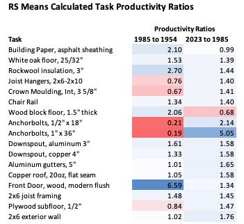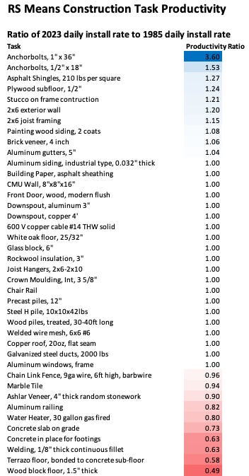 We can also use different versions of estimating guides to do our own analysis of productivity trends. The chart below shows the relative installation rates for 40 different construction tasks which are listed in the RS Means estimating guides from 1985 and 2023. 10 tasks got more productive over the period, 10 got less productive, and 20 tasks were unchanged.