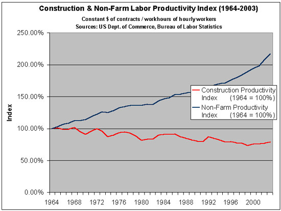 Thus, project-level measurements of US construction productivity also tend to show a stagnation or a decline in US construction productivity over time.
