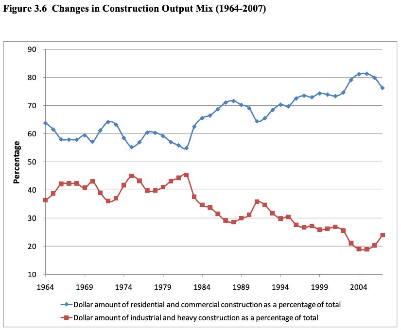 These effects of a changing output mix aren’t merely theoretical. When Allen (1985) looked at US construction productivity trends from 1968 to 1978, he found that this sort of change in the output mix — specifically, a shift from capital-intensive civil construction to labor intensive home construction — was responsible for the lion’s share of the measured productivity decline.