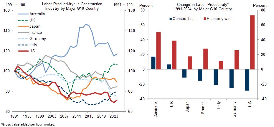 Goldman Sachs also looked at international construction productivity for several large, wealthy countries in a 2026 report. While they also found poor records of construction productivity for most countries since 1990, per their analysis the US had the worst record of construction productivity improvement of any country analyzed. This appears to stem in part from using BEA data for US productivity calculations, which yield a greater productivity decline than other US productivity metrics.