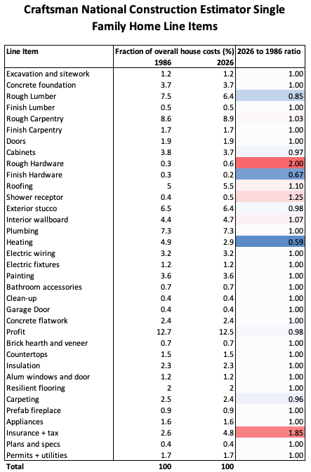 The chart below shows the relative fraction of different categories of tasks needed to build a single-family home for 1986 and 2026. Overall, there’s surprisingly little change: most task categories have the same ratio of overall costs in 1986 as they were in 2026, suggesting few types of tasks overall had much change in productivity.