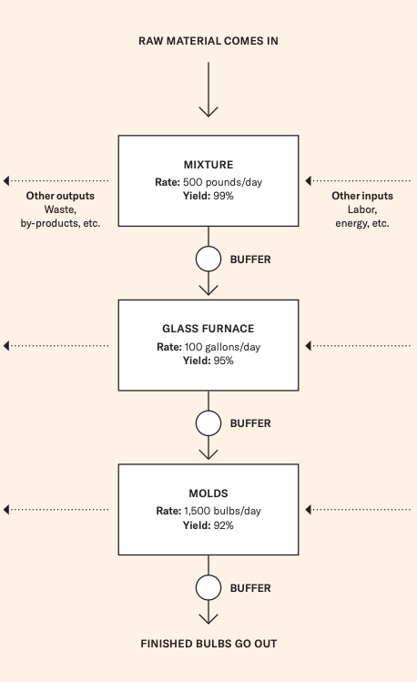Fourth, to understand whether the process is efficiently arranged, we need to keep track of how much material is in the process at any given time. At any point, some material is actively being worked on and some is waiting to be worked on. In bulb blank production, once the raw materials had been added to the crucible, it might take a while before the glass was gathered by workers and blown into bulbs. If crucibles were filled once a week, there would be about half a week’s worth of molten glass waiting to be turned into bulbs at any given time. Any material that isn’t currently being worked on is considered to be in a buffer of available material. The total amount of material in the system—that is, the combination of what’s in the buffer and what’s being worked on—is collectively known as work in process.