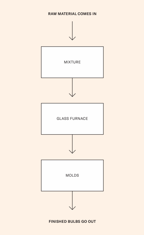 We can draw this series of steps using a process flow diagram, a visual representation of how a process unfolds. See Figure 2 for an example of what the bulb blank process might look like. Making bulb blanks is an example of what we’ll call a production process—a series of steps through which input materials are transformed incrementally into a finished product. Each step in the process induces some change in the input material. The changed material is then passed on to the next step, which makes another change, and so on, until the finished product comes out the other side. In the bulb blank process, sand, lead, and other chemicals are the inputs. These are gradually transformed by heat, chemical reactions, and physical manipulation until a finished bulb blank emerges at the other end.